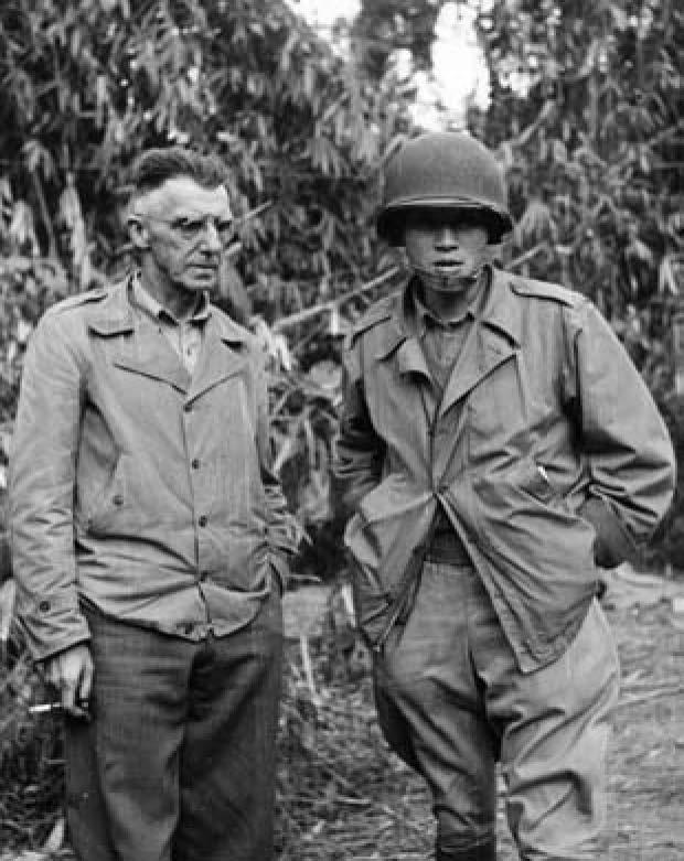 孟关—瓦鲁班战役后,史迪威和中国将领一起观看缴获的日军旗帜。
