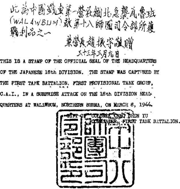战斗结束后,坦克兵们发现,这一战最值得记录的缴获,既不是六门大炮,也不是被视作稀罕玩意儿的日本海带,而是一个不大的印章,这就是日本陆军第18师团的关防。对中国军队来说,抗战以来获得敌军师团关防,这还是第一次。