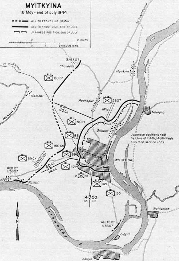 密支那之战的英文版地图,画面下方标有150的地方就是150团绕袭第一横马路的地点。
