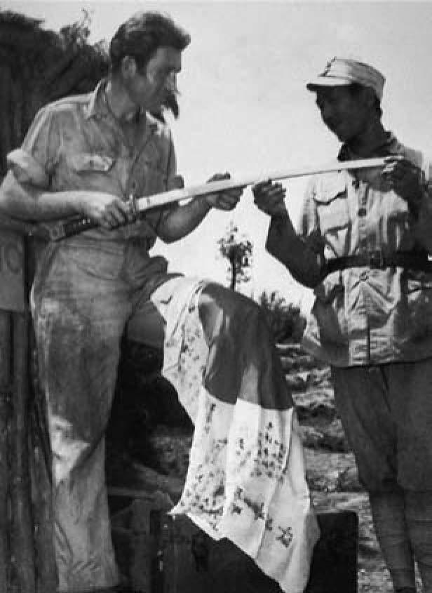 9月11日,拿下松山后一名中国兵和一名美军顾问共同欣赏缴获的日本军刀。
