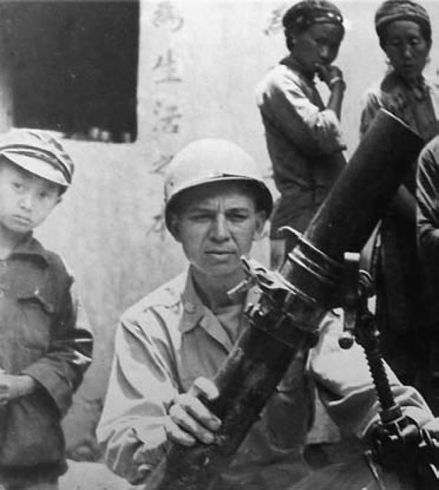 滇西前线,美军顾问在向民众展示缴获的日军迫击炮。