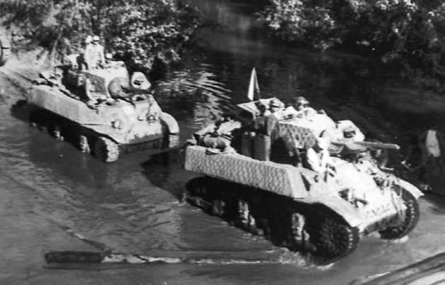 不过,这次在英开塘的战斗,理查德森自嘲是在“半梦半醒”中加入了战团。“我当时是(译扬基,又译美国佬)杂志的记者,对于即将爆发的战斗一无所知。战车部队总是很有魅力,我碰上了布朗上校的时候,对他说我是个记者,想采访他的部队拿点儿一手材料。赶巧的是他们正要出发,于是上校说他们有更重要的事儿要干。我想他肯定把我当成了个添麻烦的,于是对他说,我当过B-24轰炸机的机枪手,也许跟着部队出发不会是累赘。为了说服他,我稍微吹了点儿牛,谈起我在B-24飞机的腰部枪塔曾经奋勇打退来袭的四架零式战斗机。我想我说服了他,而且估摸着他会把我放在指挥车里,给我一挺机枪。”